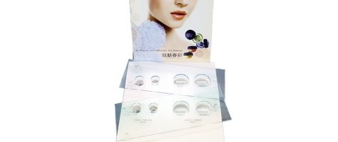 桌上型化妝品展示架,斜面設計以利置放多款試用產品,背板印刷裱背。