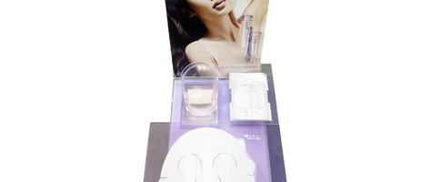 桌上型化妝品展示架,以淡紫半透明壓克力板 / 鏡板 / 半透光霧板來推疊出多層次設計,面膜模型用壓克力1:1比例烤出半弧形立體線條以吸引消費者眼光,背板印刷裱背。