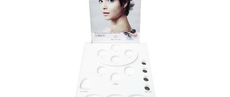 桌上型化妝品展示架,高質感珠光色設計,二片曲型背板四角置入磁鐵以吸附廣告DM。產品設置架亦置入磁鐵以利固定。