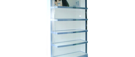 美髮產品落地型展示櫃,明亮的作色吸引消費者目光,層板設計以區隔不同產品。